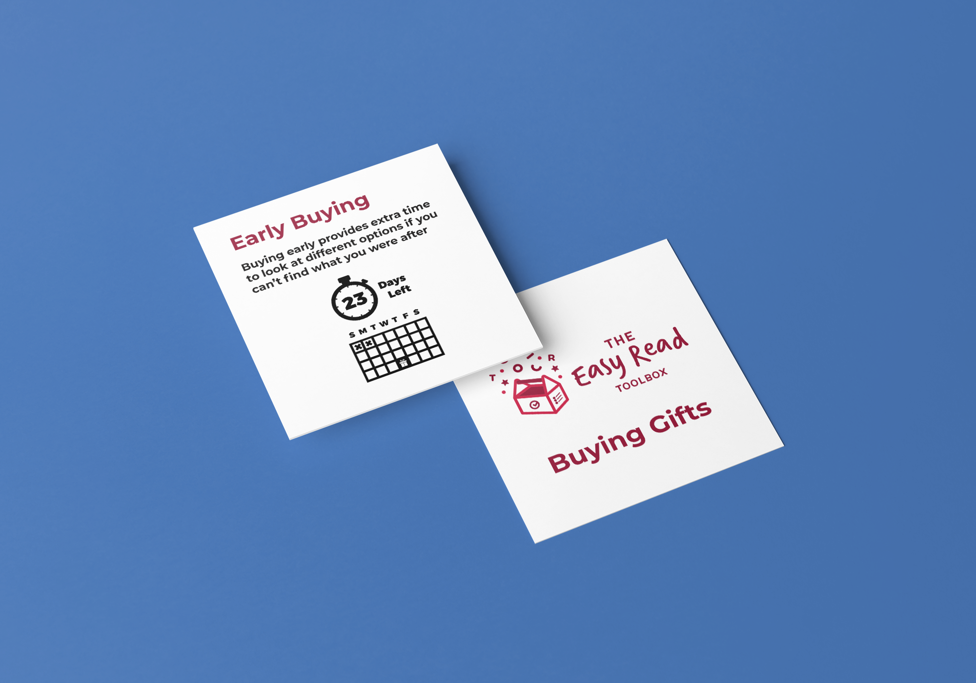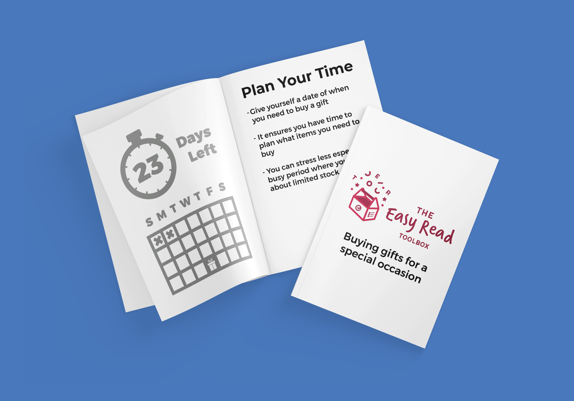 The Easy Read Toolbox aims to assist this field by using a correct approach to applying layout design such as imagery or wording to assist with teaching topics. Each year involves regular icons to educate a specified theme. The end of 2024 would see the festive season to celebrate Christmas and New Year’s as holidays particularly gift-giving involved. The design would involve the processes and considerations for gift giving such as budget, understanding a receiver’s interest or time management.