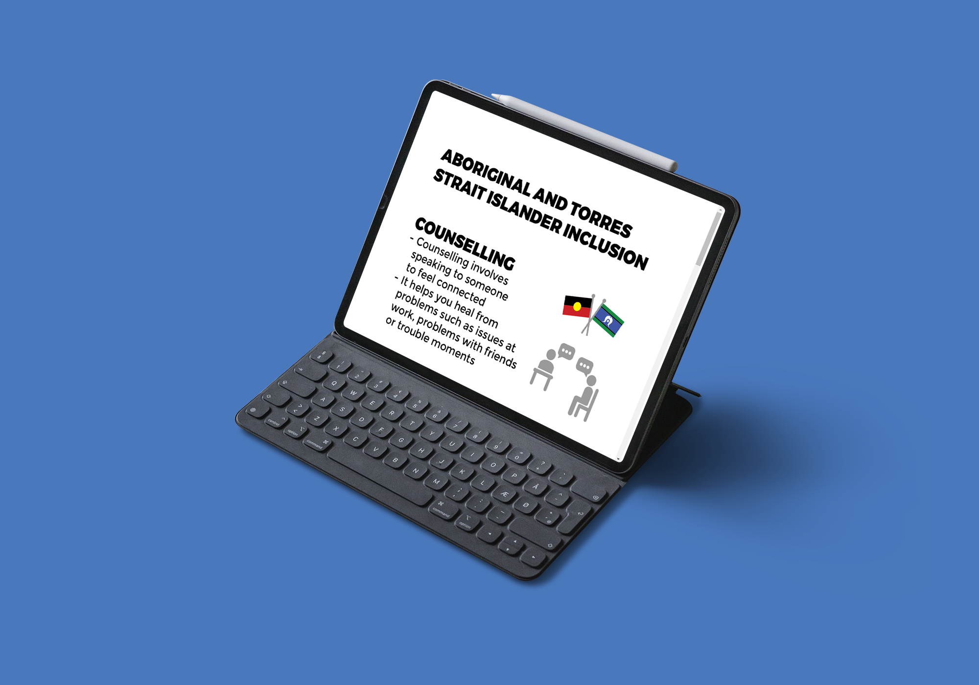 The design involved communicating to the end-user group about services dedicated to Indigenous and Torres strait islanders to maintain a positive lifestyle, and improved health, as well as external stakeholders are required to understand inclusion. The design involved applying the flags of the two areas to demonstrate the target of the services is focused on Australian Indigenous and Torres Strait Islanders. The icon designs involved applying the steps of services such as people talking to each other during counselling or people living under a roof. The examples show the needs, benefits, and procedures during the services.