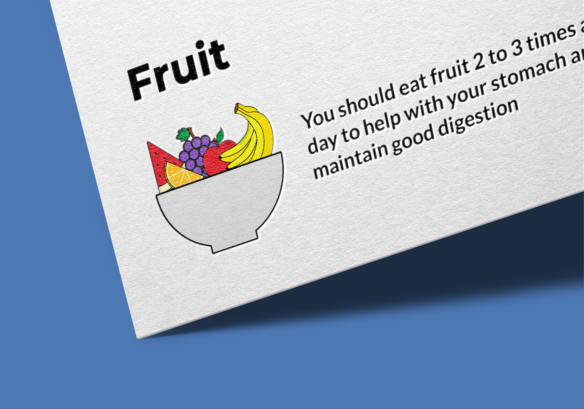 The design involved applying colour to different common food types that offer protein, carbohydrates, vitamins and minerals, and fibre. The icons demonstrate the common meal types through an image, with the teaching style of simplistic layout teaching how certain food improve specific health areas, and appropriate times to eat certain foods. The set of icons strives to assist with the everyday routine of eating to understand balanced nutrition, improve digestive health, avoid bodily issues, and maintain physical health through eating.