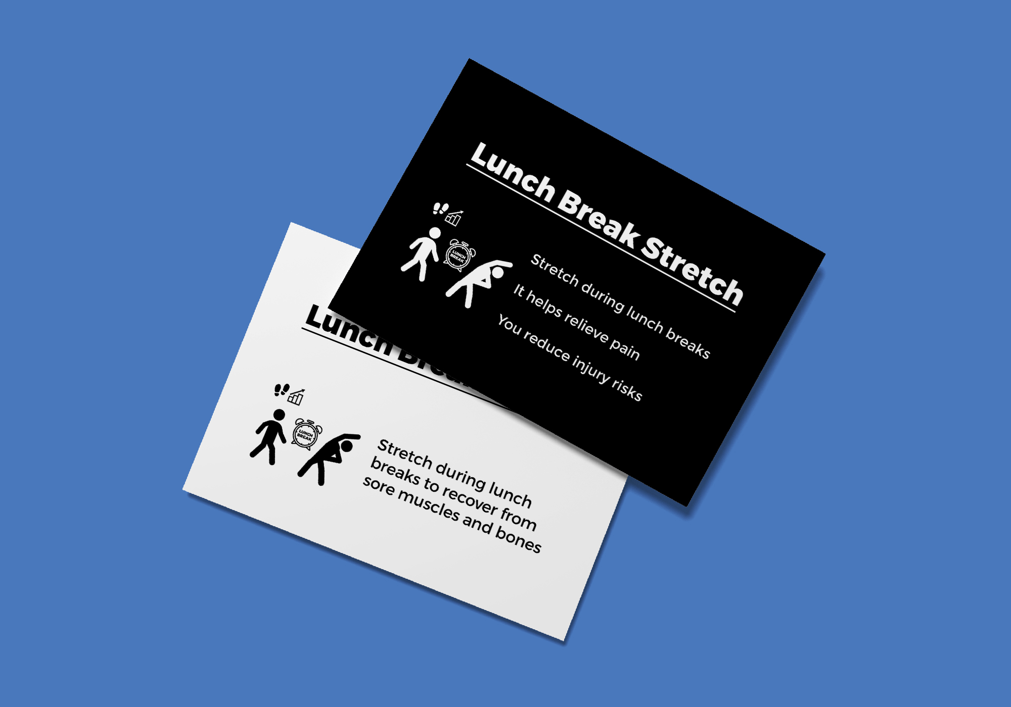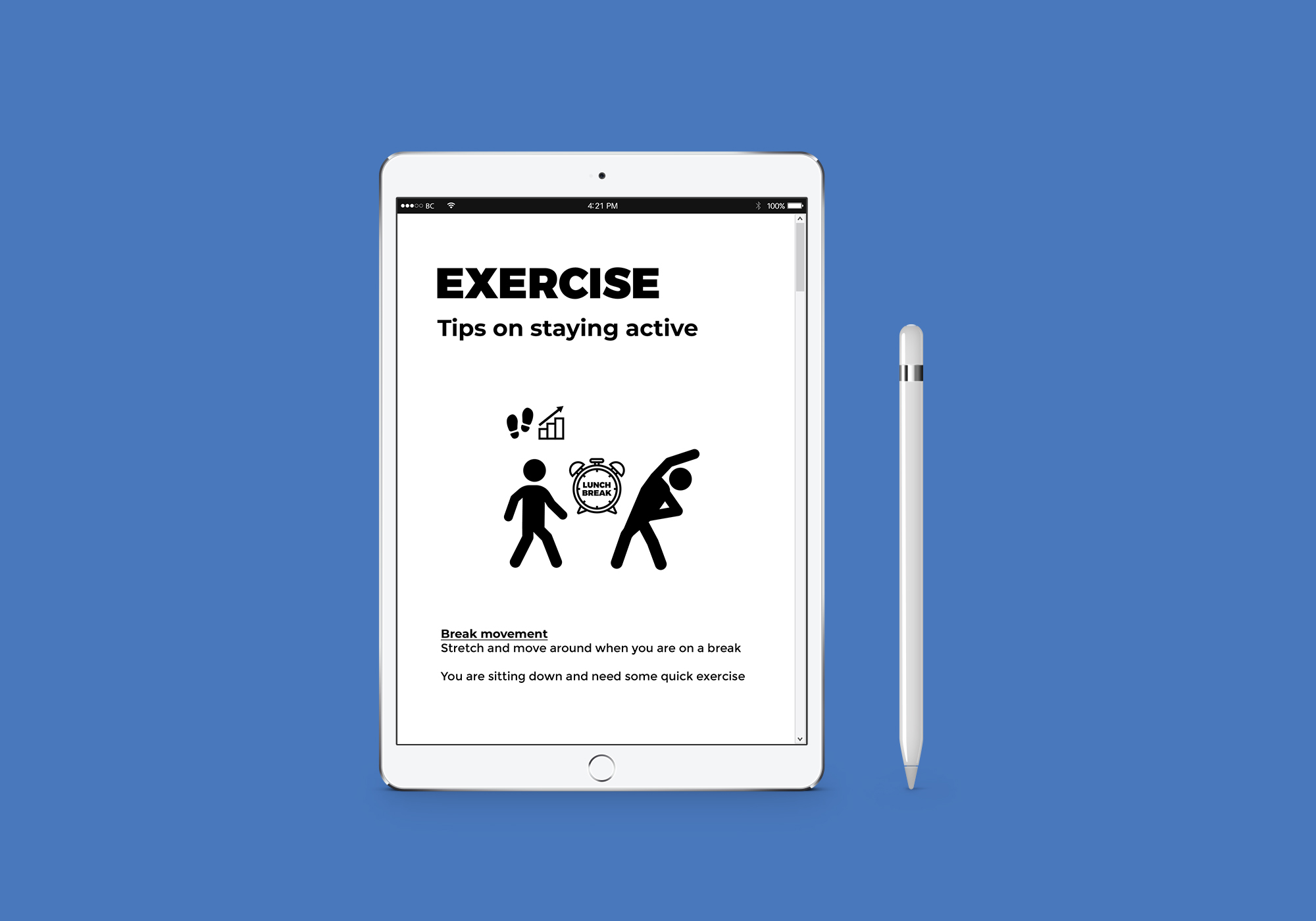 The design consisted of icons of people participating in different activities to convey the functions and mechanics such as walking and swimming. Settings were applied to show the environment of different physical activities such as walking around shops and hiking on mountains. The design allows the end-users to understand the situations involved in styles and to be aware of the distinct areas of physical activity, that movement, exercise, and physical activity is for everyone.