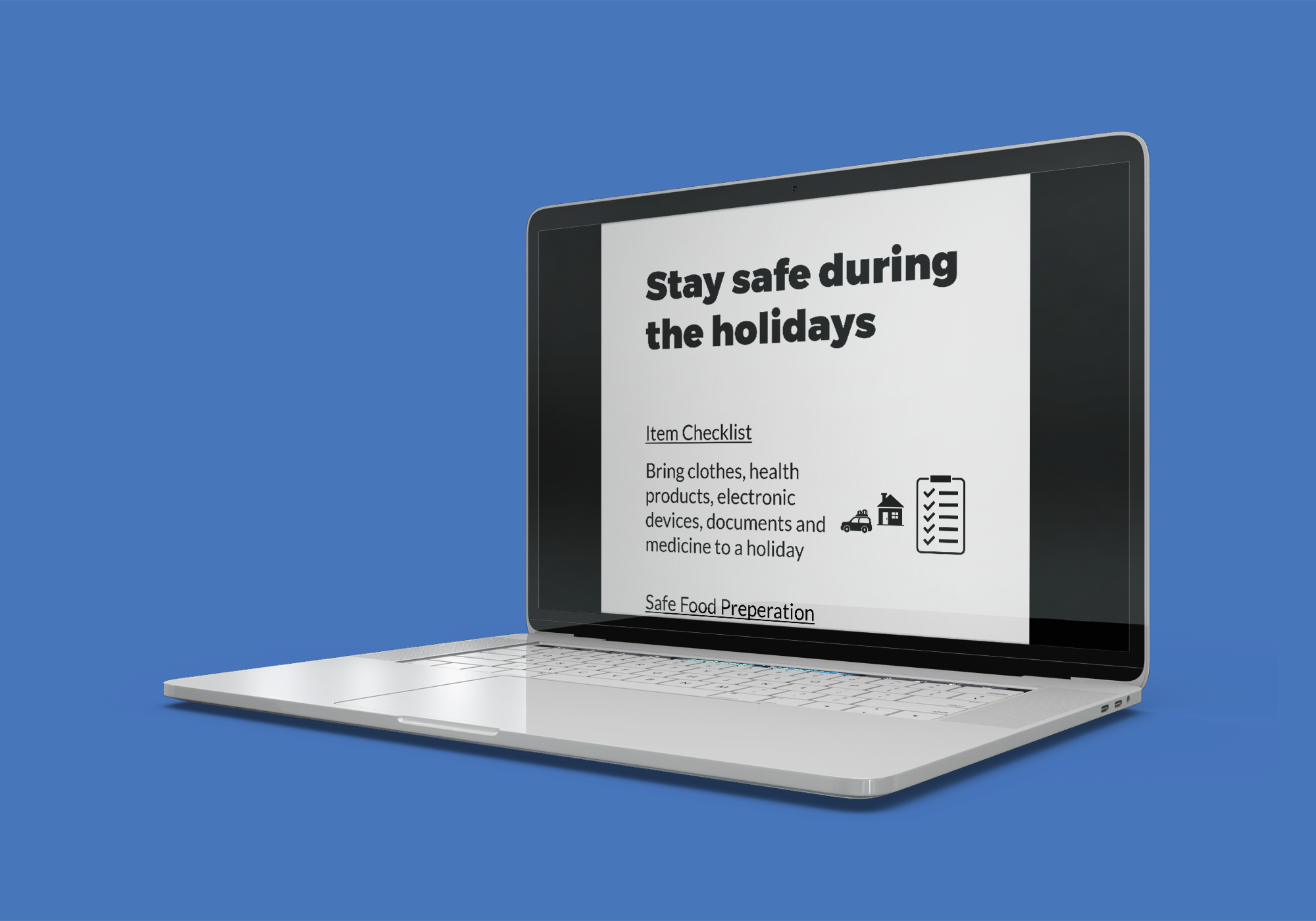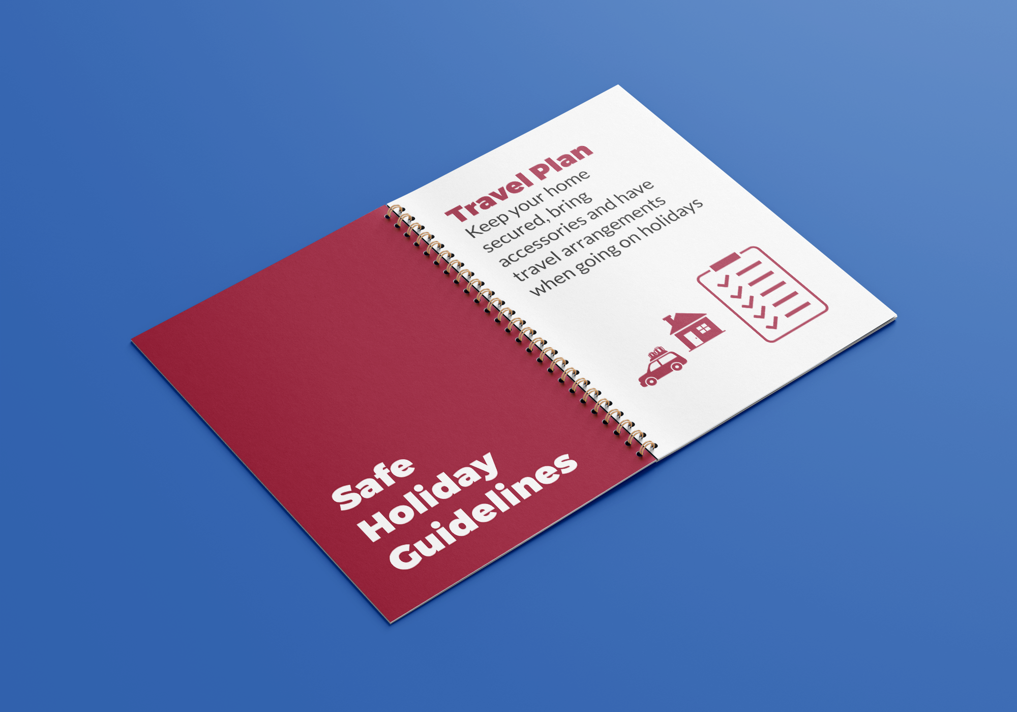 The design involved communicating safety requirements during holidays such as using ladders safely for home decorations, protecting a home while travelling, awareness of alcohol overconsumption and mindfulness over drunk driving. The design requires incorporating equipment and warning signs within the designs. The imagery allows teaching planning activities and requires processes during holiday periods to ensure an enjoyable safe experience.