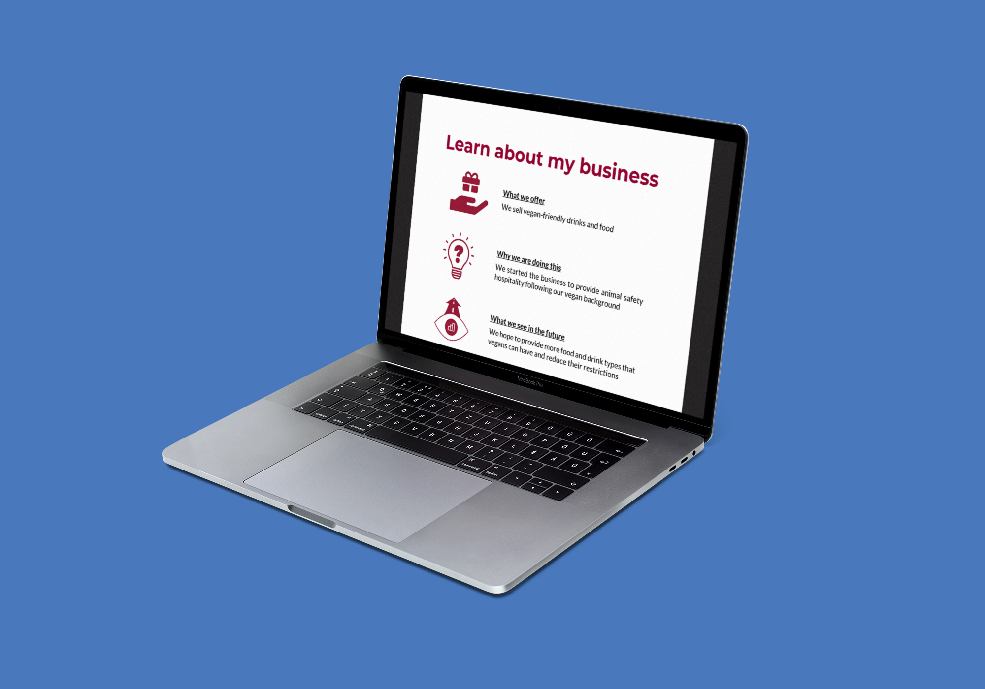 The project involved developing icons in 2022 for a pilot study to build market entry trust. The Easy Read Toolbox provided training modules to understand format design, the influence of icons, layout guidelines and the need for accessibility. The pilot study saw the participants apply the icons to explain the standard structures of a business such as operations, revenue streams and expenses. The outcome saw participants finding the process unique, and helpful to create easy learning. The process helped distinguish easy learning from “easy English” by distinctly focusing on format design over altered grammar. In addition, the template and examples are supportive to understand their approach to teaching inclusively.